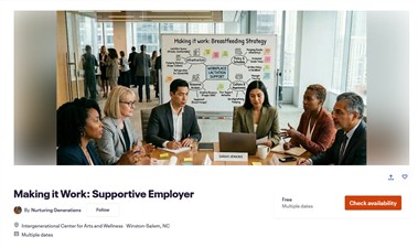 Nurturing Generations brings the NC Making It Work toolkit to life by giving employers an effortless, turnkey way to build lactation-friendly policies and gold standard pumping spaces to support parents returing to work, boost engagement and improve retention. This series is a professionally led, evidence-based program made accessible through grant funding in partnership with Improving Community Outcomes for Maternal and Child Health (ICO4MCH) initiative of the Forsyth County Department of Public Health. The series for supportive employers is meant for organizational leaders and decision makers. Taking place every Thursday in May our lunch sessions will be hosted at the Integenerational Center for Arts and Wellness.
