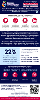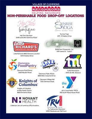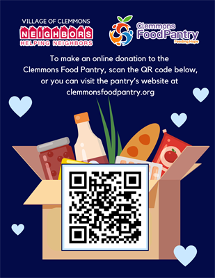 During the month of February, the Village of Clemmons sponsors a month-long campaign we call "Neighbors Helping Neighbors" – an educational and collection campaign for the Clemmons Food Pantry. Local businesses and organizations in the Clemmons area are asked to volunteer to host a food pantry collection box. All money raised and food collected goes directly to the Clemmons Food Pantry to help anyone in need.